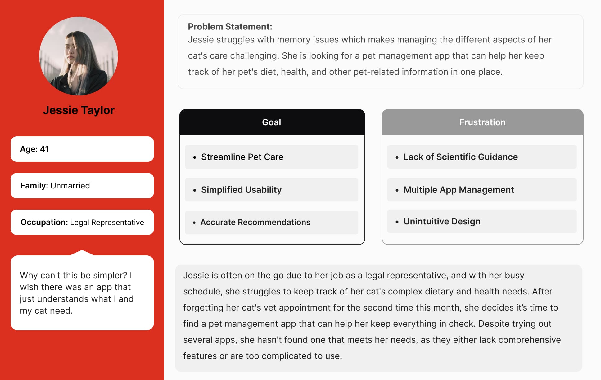 Managing household pets is a complex task that requires a multifaceted approach. First, I installed several existing pet management apps to evaluate their advantages and disadvantages. Subsequently, I conducted user research, which served as the foundation for developing a user persona.